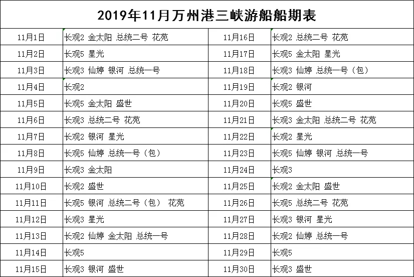 2019年11月万州港船期信息表