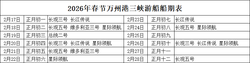 2026年春节万州港船期信息表